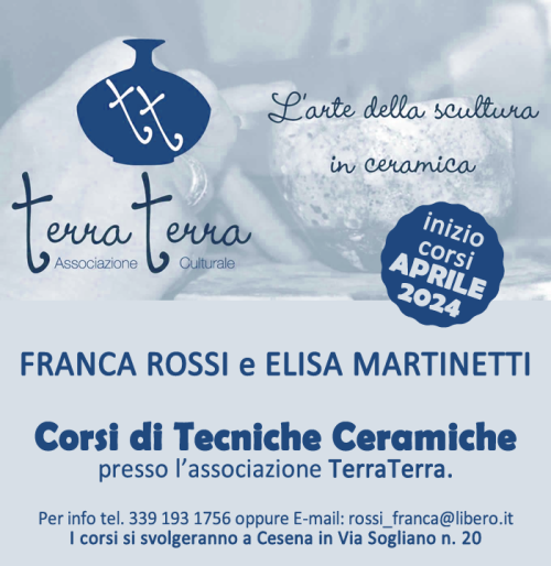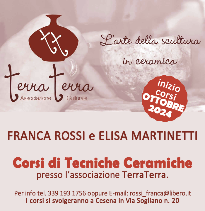 Eventi , Senza categoriaCorsi di Tecniche Ceramiche da Ottobre 2024 Posted By Laura on settembre 27,2024 Corsi di Tecniche Ceramiche da Ottobre 2024 Franca Rossi e Elisa Martinetti informano che da Ottobre 2024 ricominciano i Corsi di Tecniche Ceramiche presso l’associazione TerraTerra Per info tel. 339 193 1756 o rossi_franca@libero.it I corsi si svolgeranno a Cesena in Via Sogliano n. 20